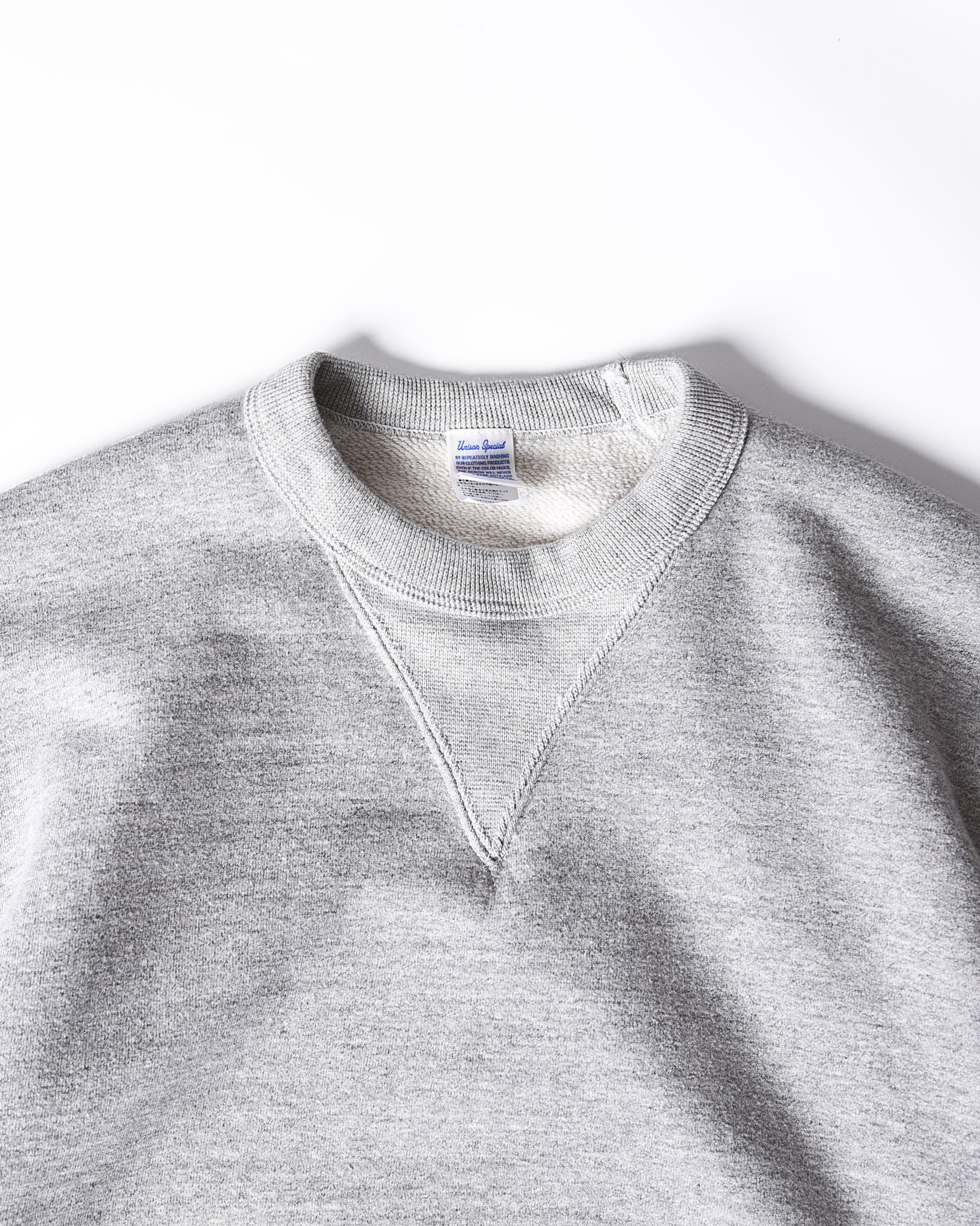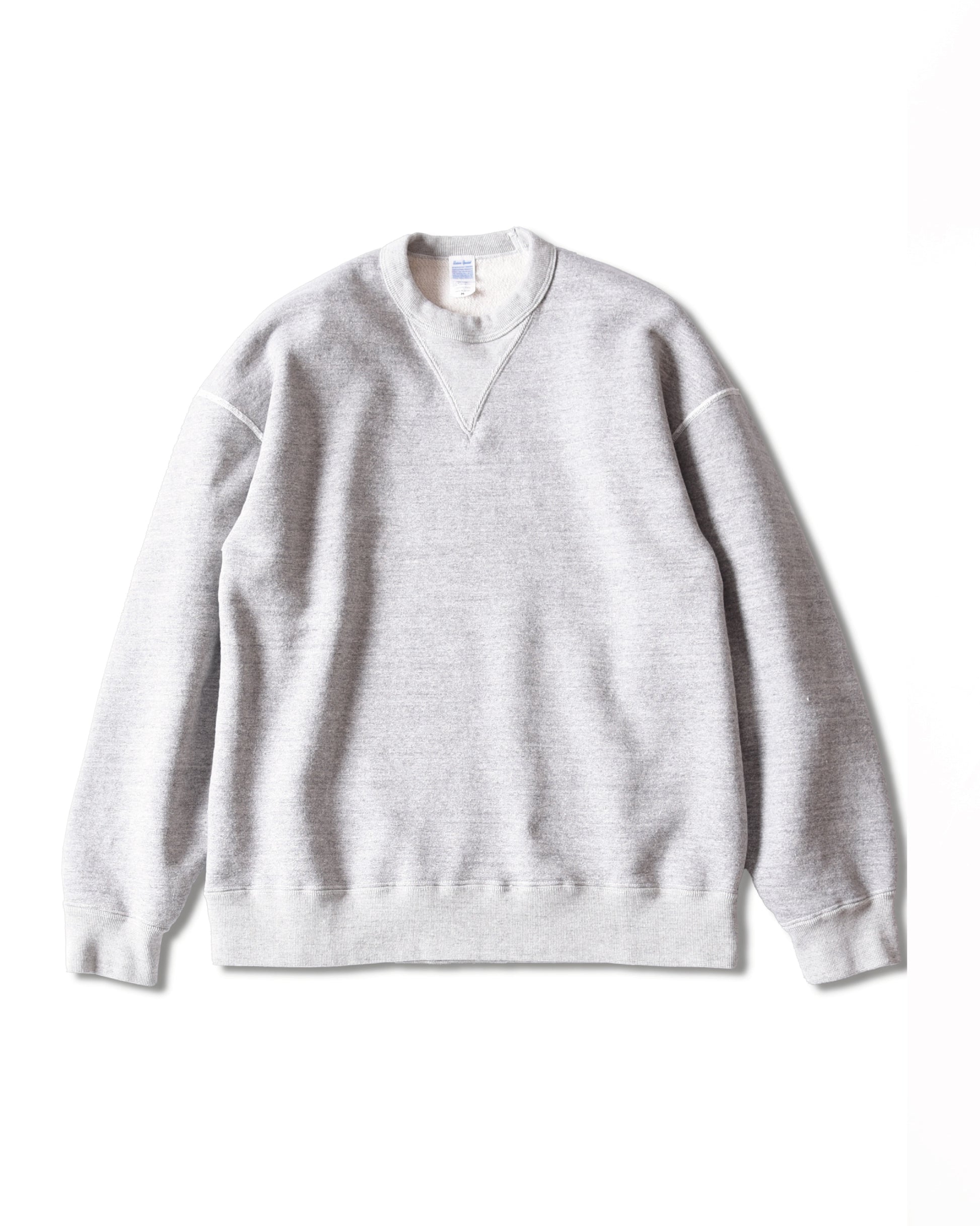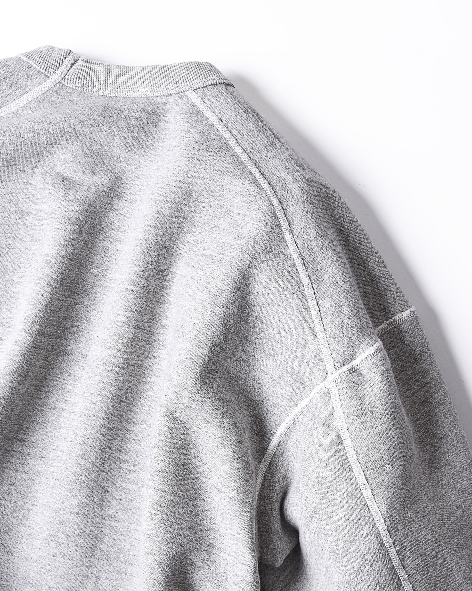 通常の内側にある袖のガゼットを敢えて後ろ側に配置。丸胴スウェットにはない肩が落ちるしなやかなシルエットが実現し、ありそうでない1枚に仕上がりました。