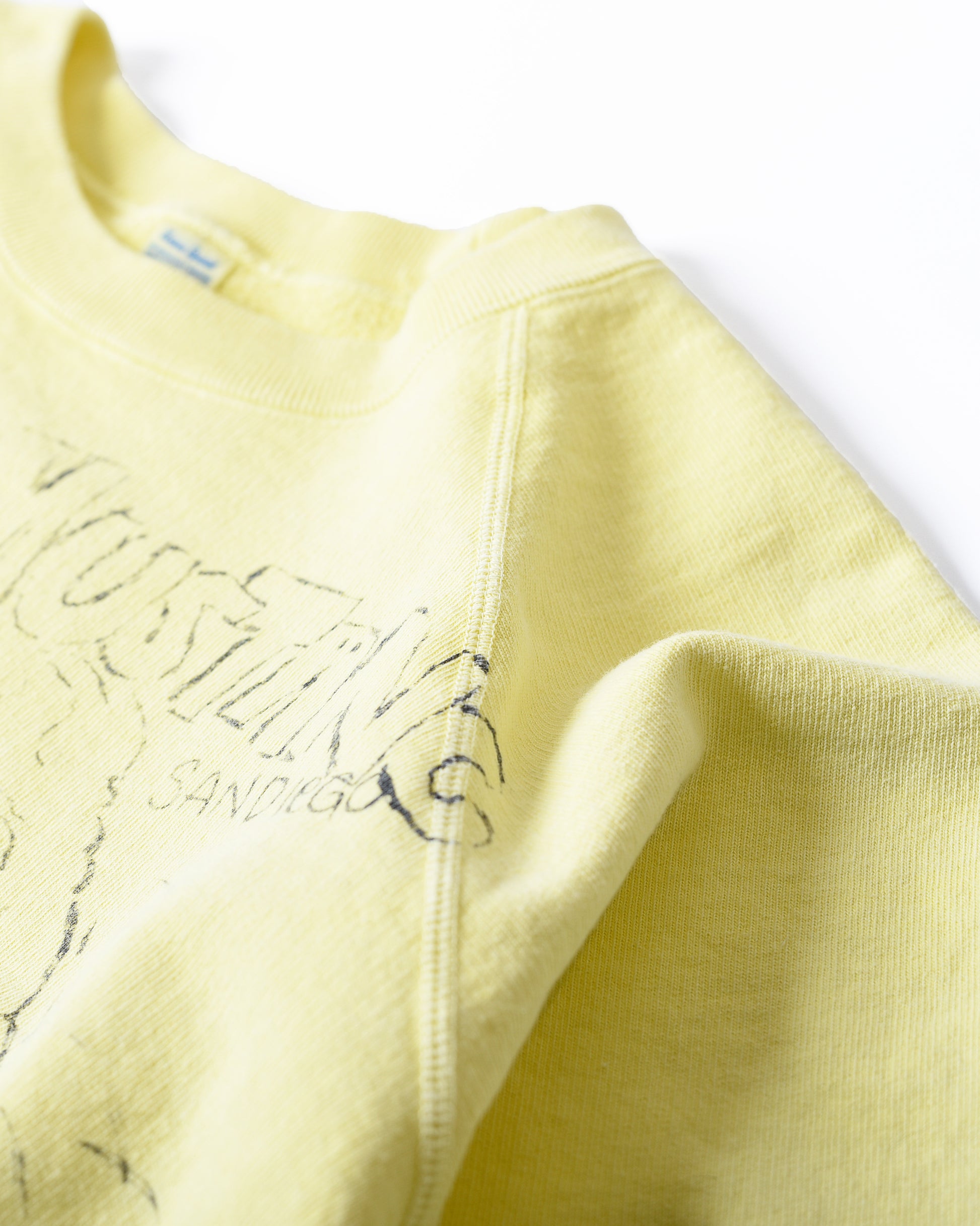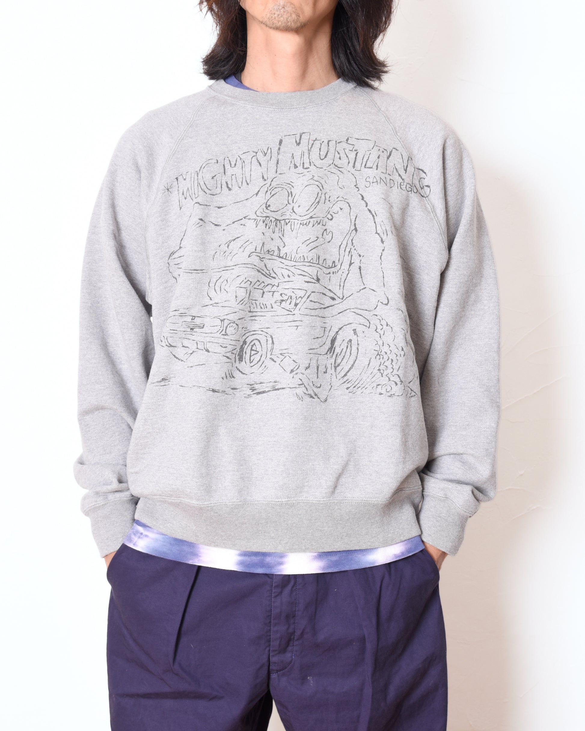 また、肩パーツにまで届くほどの大きい版を使用し、身ごろからはみ出たプリントに。 こちらは当時の落書きスウェットを模しており、本当に落書きされたように見えるよう敢えて縫製したのちにプリントを施しています。 直接手書きしたのかようなかすれて見える絶妙なプリント具合も注目いただきたいです。