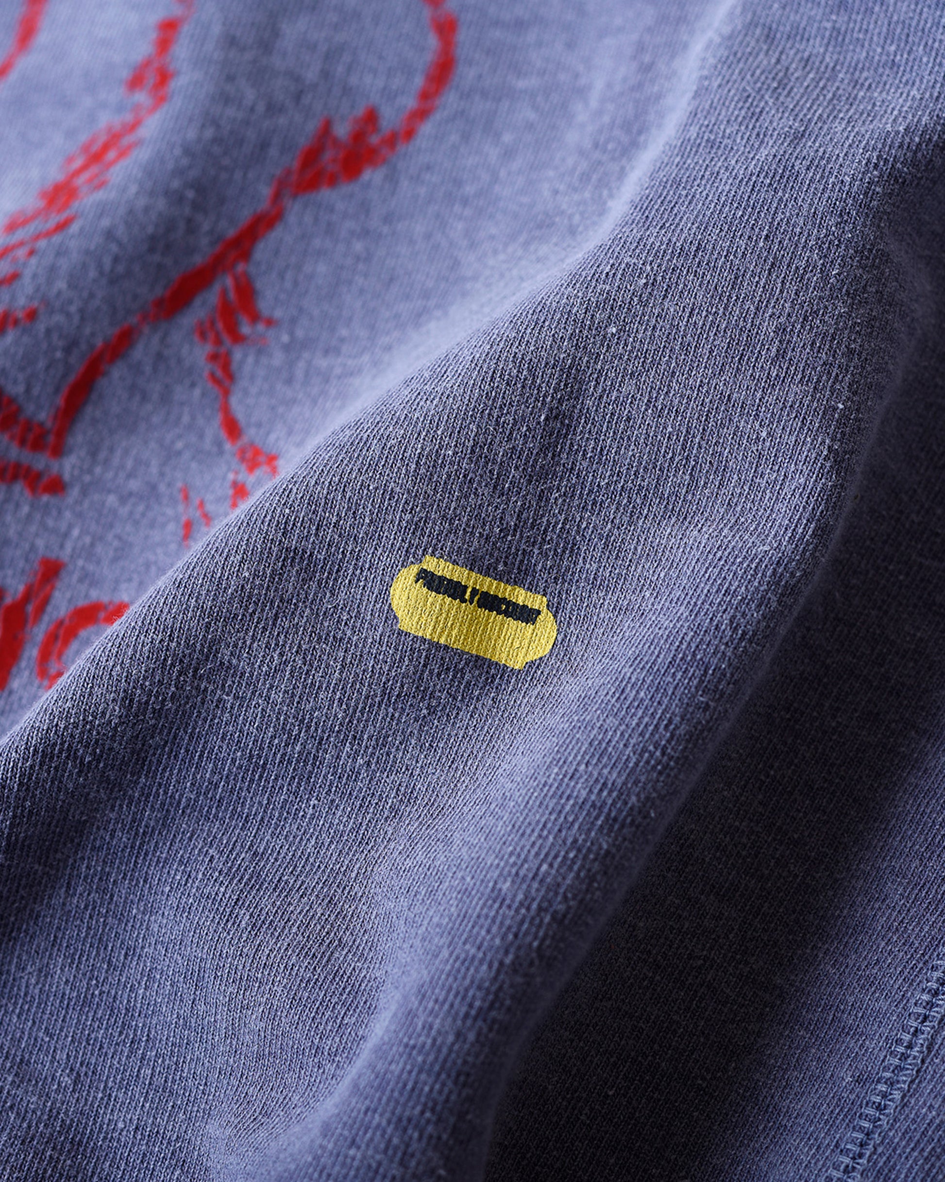 プリントはフロッキーキープリントを採用。ヴィンテージスウェットのようにひび割れしている見えるよう、敢えて割れた状態のデザインでプリントしています。
